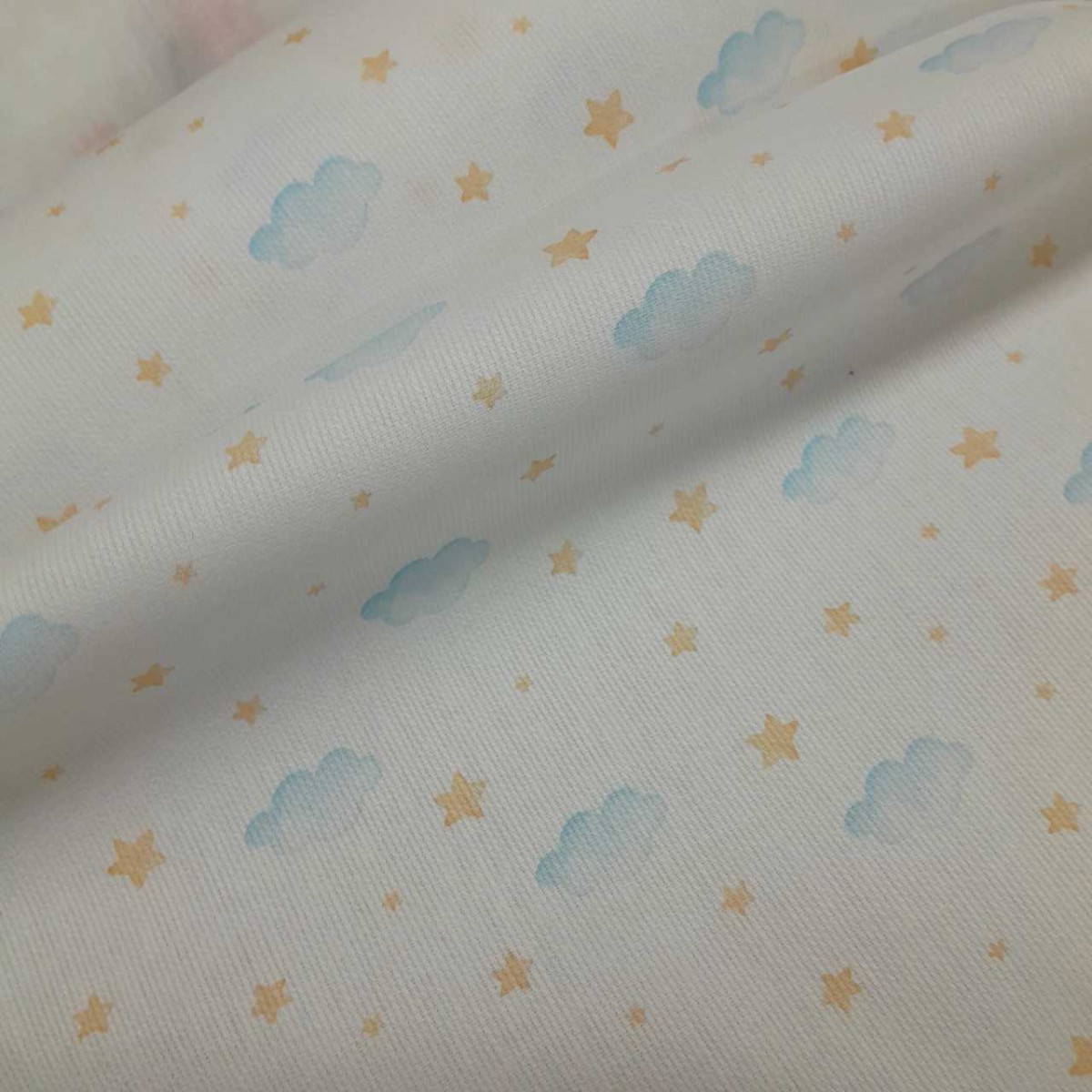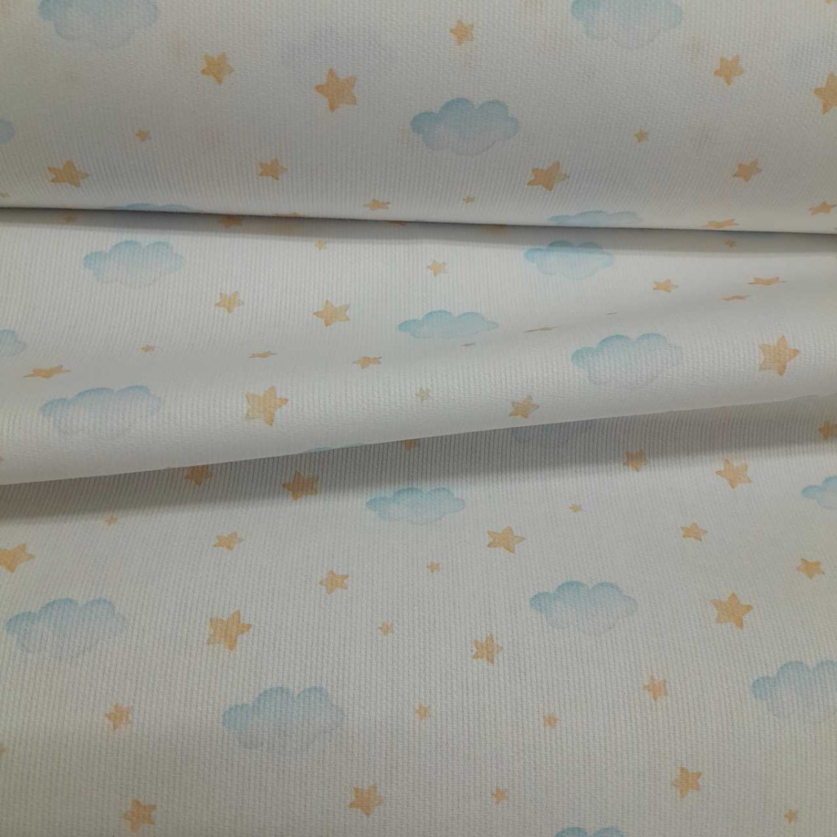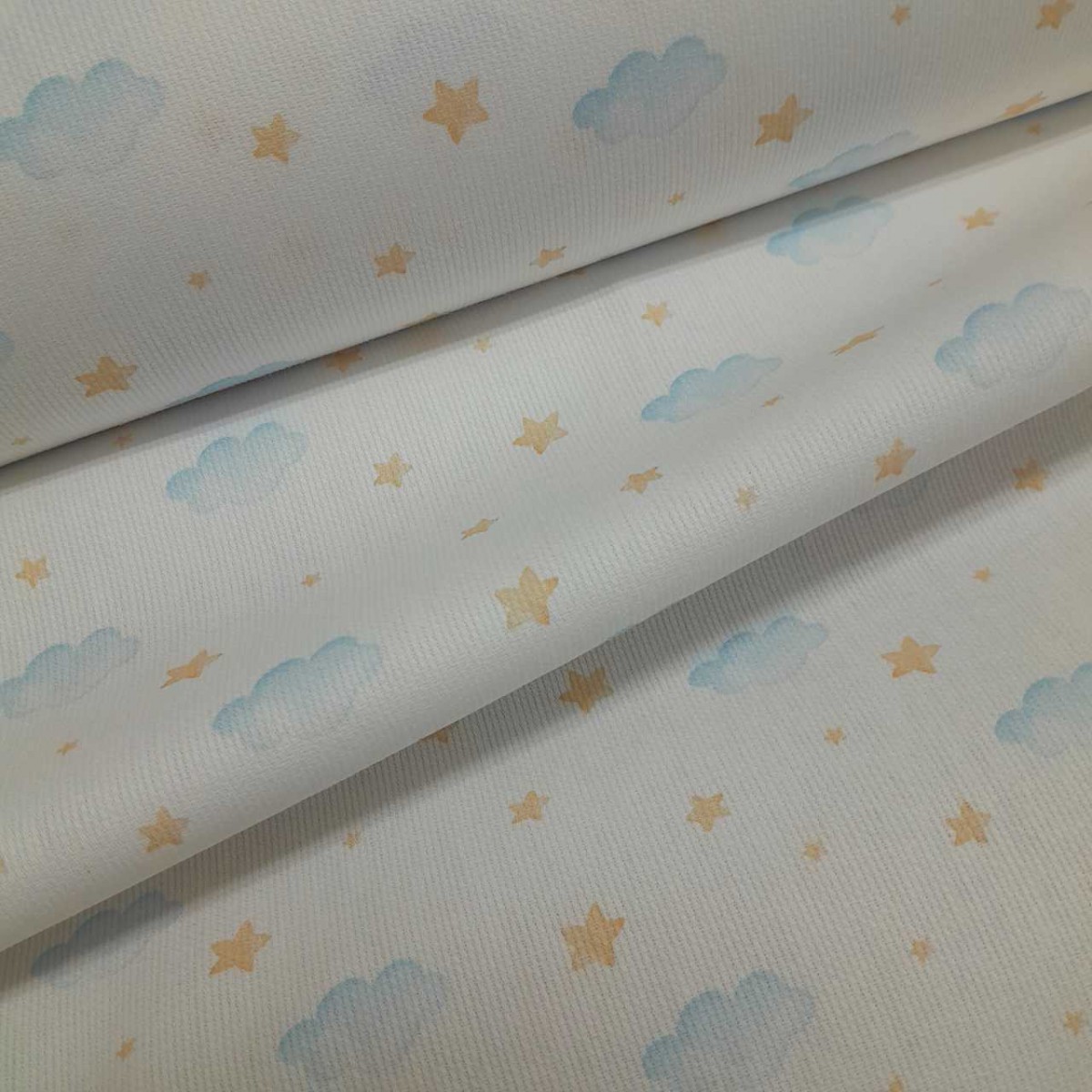 Modelo de piqué infantil  con dibujo de nubecitas azules con salpicado de estrellitas  y  fondo blanco. 100% algodón de primerísima calidad. Para bebé/infantil, decoración, ropa de cuna, cambiadores...