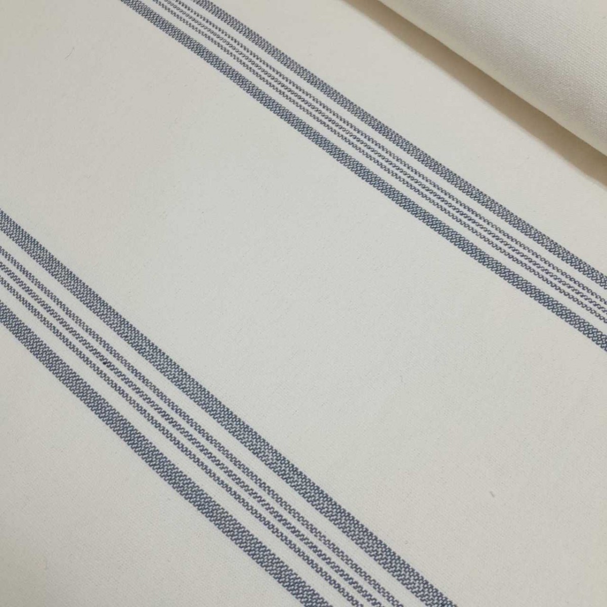 • Descripción: Tejido fuerte y grueso con la base en color crudo y raya tejida en color azul.