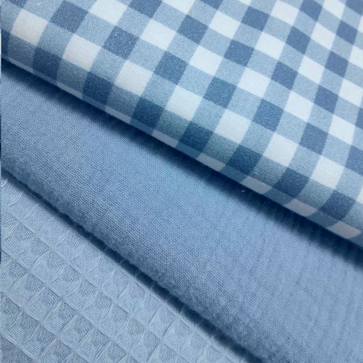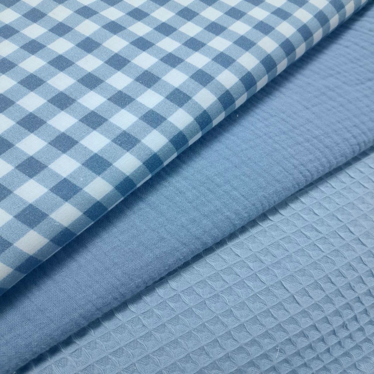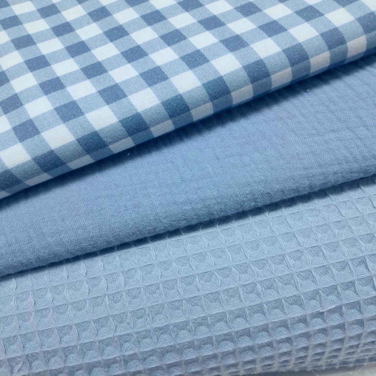 Coordinado de muselina, waffle y cuadros de algodón azul  petróleo. Composición: 100% algodón tanto el waffle como el cuadro como la bambula muselina. Ancho: 1,50 m. Para arrullos, ropa infantil en general, mantitas, neceseres,pañaleras, plaids, petos y culetines niño.
